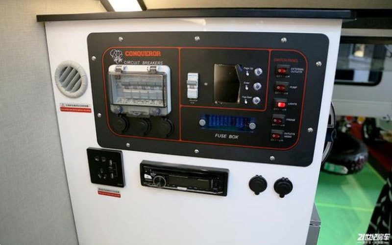 Above the sofa is the central control panel for managing interior lighting and various electrical switches. The electrical system features a 200W portable solar panel and a 200Ah gel battery. The circuit breaker box is also located here for convenient maintenance of the electrical system. Adjacent to the tailgate is a storage cabinet and an embedded 45L Indel B vehicle refrigerator, which can also store fresh ingredients for daily use.