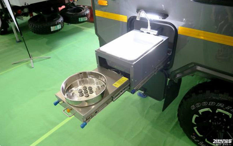 The right side of the vehicle features an outdoor kitchen with LED lighting, equipped with a pull-out high-heat stove and a sink for convenient outdoor cooking. This setup allows you to enjoy the surrounding scenery while preventing cooking fumes from entering the cabin, eliminating the hassle of cleaning grease stains inside the vehicle. The LED lights deliver exceptionally high brightness, as shown in the image above, providing excellent illumination even during daylight hours. Additionally, positioning the outdoor kitchen on the right side aligns with China's driving conditions. When pulling over to the right side of the road, drivers can easily find nearby temporary parking areas. After parking, if vehicle maintenance is needed, this placement ensures the safety of passengers seated on the inner side of the vehicle.