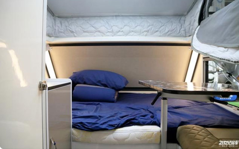 Given the limited interior space, the designer cleverly designated the area to the right of the entrance as a versatile work and social zone. The swivel table adjusts to multiple angles. The sofa measures 865×560(mm), with thick cushions providing comfortable seating and adequate leg support. While it lacks a fixed backrest, you can add your own pillow for support. Below lies the fuel-powered heating system's air vent, effectively warming feet during winter months and maintaining a comfortable cabin temperature.