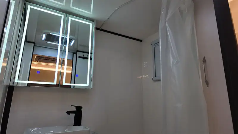 DC Fan | Stainless Steel Faucet | Porcelain Sink | Mirrored Cabinet |